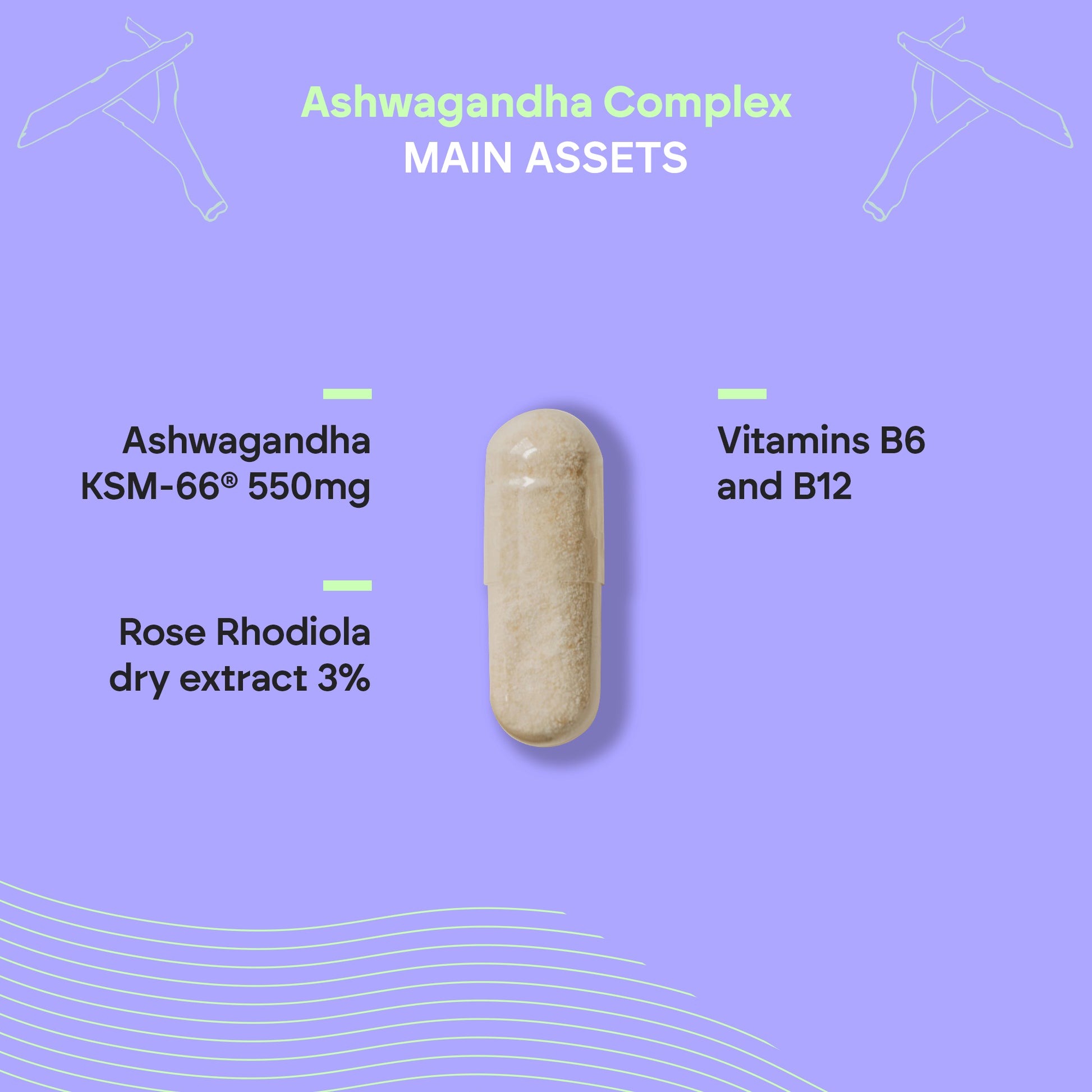 Ashwagandha Complex contiene ingredientes como la vitamina B6 y b12 que contribuyen al metabolismo energético normal y ayudan a disminuir el cansancio y la fatiga.