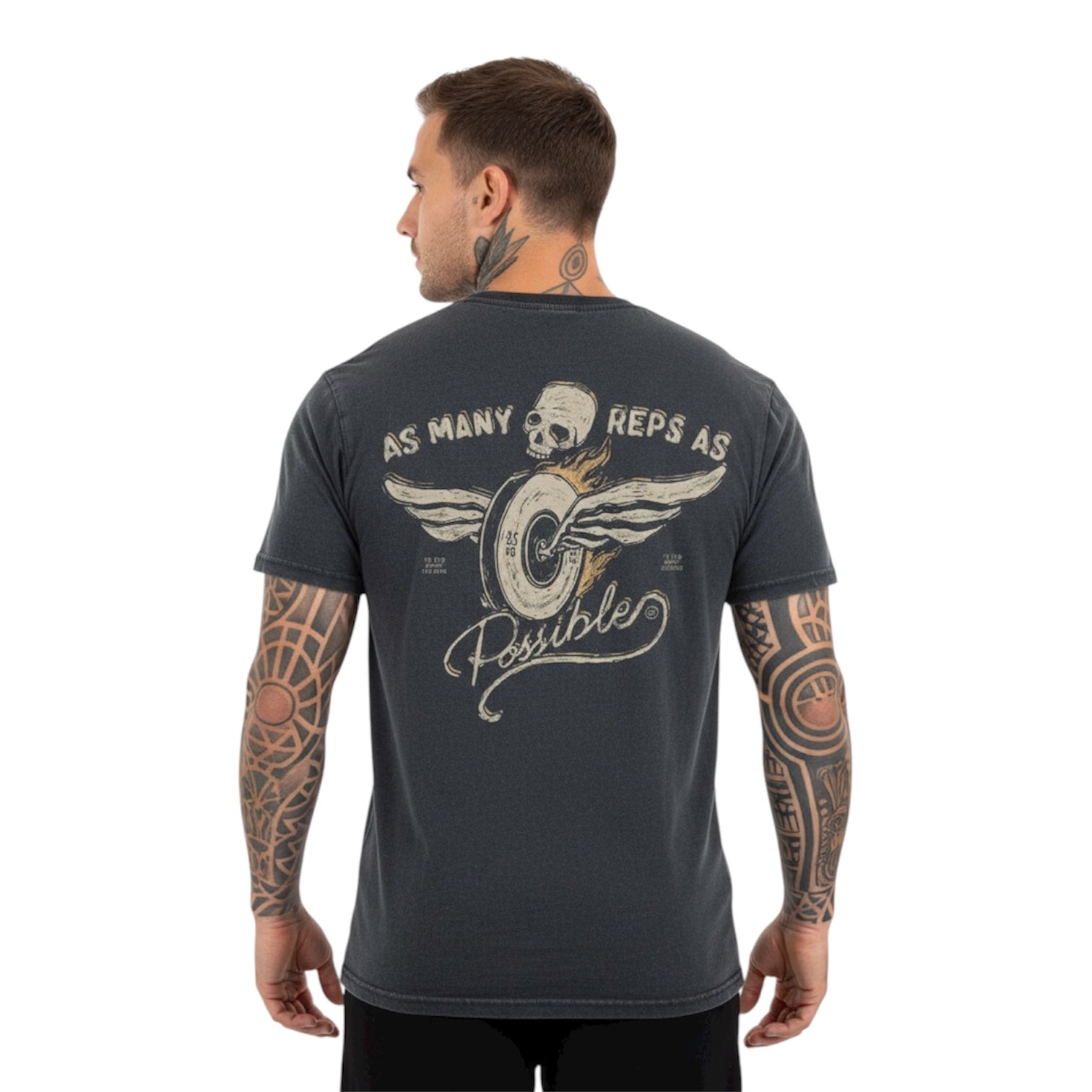 Esta t-shirt apresenta um design inspirado no termo AMRAP (As Many Reps As Possible). Fabricada em 100% algodão orgânico e com um peso de 155 g/m², o seu corte unissexo regular e as mangas curtas garantem um ótimo conforto e um ajuste perfeito. Além disso, a sua cor preta lavada e as costuras desfiadas conferem um toque único. Com um estampado grande nas costas e um pequeno na frente, possui as certificações PETA, Fair Wear e Oeko-Tex.