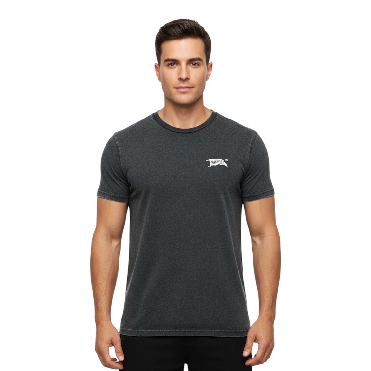 O efeito desgastado em todas as costuras e o tingimento pós-produção tornam esta peça única e distinta. Disponível em preto lavado, esta t-shirt apresenta um estampado frontal pequeno e um estampado traseira maior.