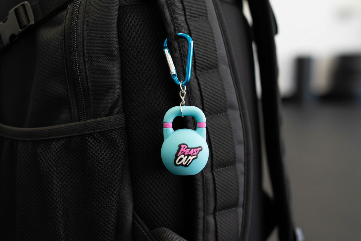 Llavero kettlebell BeastOut en color azul con mosquetón.